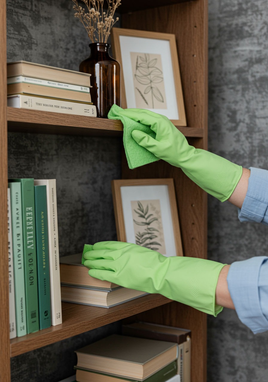 Today let's clear off your nightstands and the top of your dressers and first give them a good dusting. These areas are often neglected and tend to collect a lot of dust. Then, re-evaluate what you have on top of these spaces, is everything functional? Do the remote batteries need to be replaced? Can you get rid of anything here?